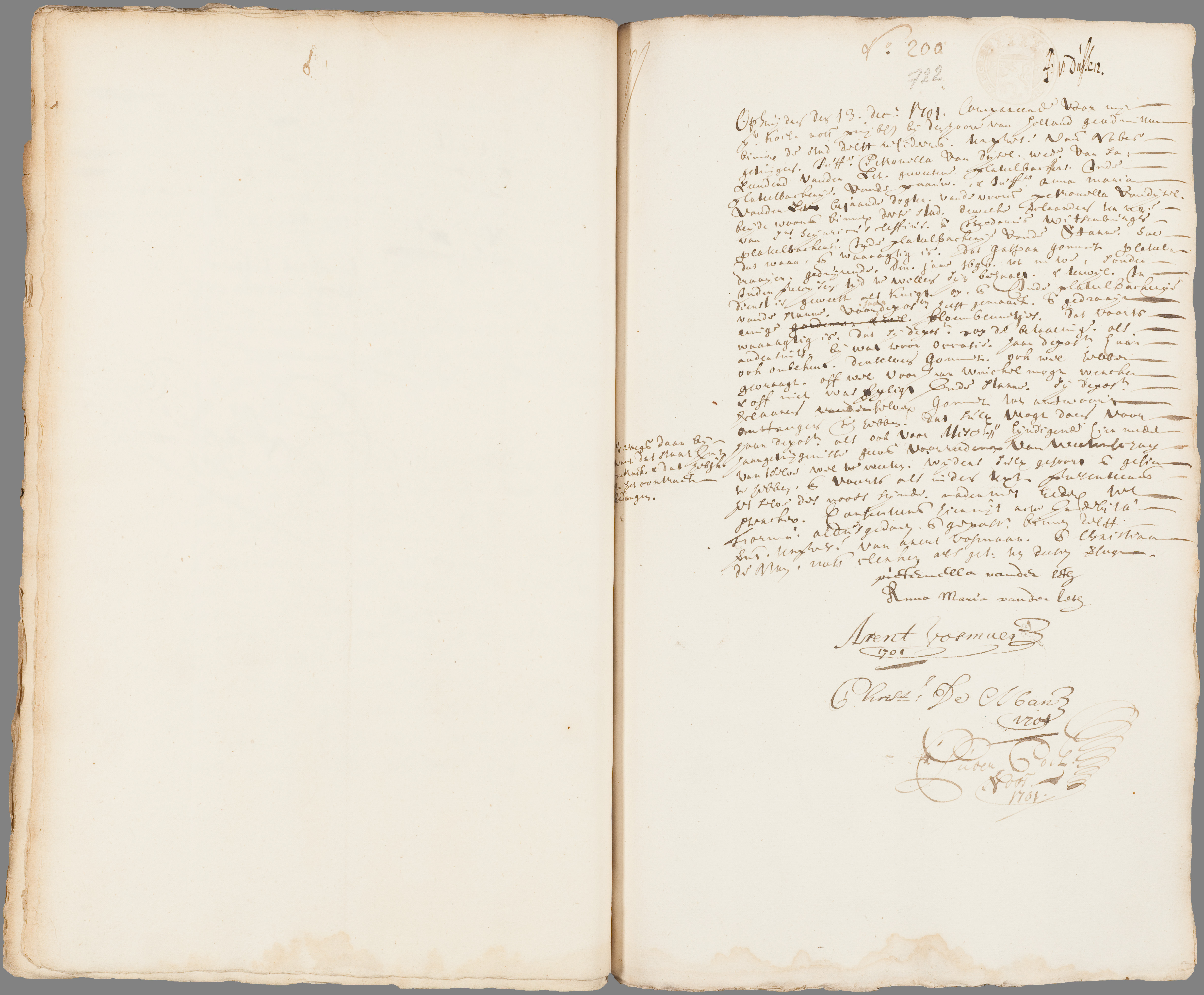 This is indeed an interesting deed. It concerns an official declaration made by Petronella van Dijsel, widow of Leenderd vanden Let (who was a pottery baker in the pottery called De Paauw [The Peacock]) and her daughter Anna Maria vanden Let, unmarried daughter (come of age, so 25 years or older), both living in Delft at the request of Heijnricus Cleffius and Theodorus Witsenburgh, both pottery bakers in the pottery factory called De Starre.