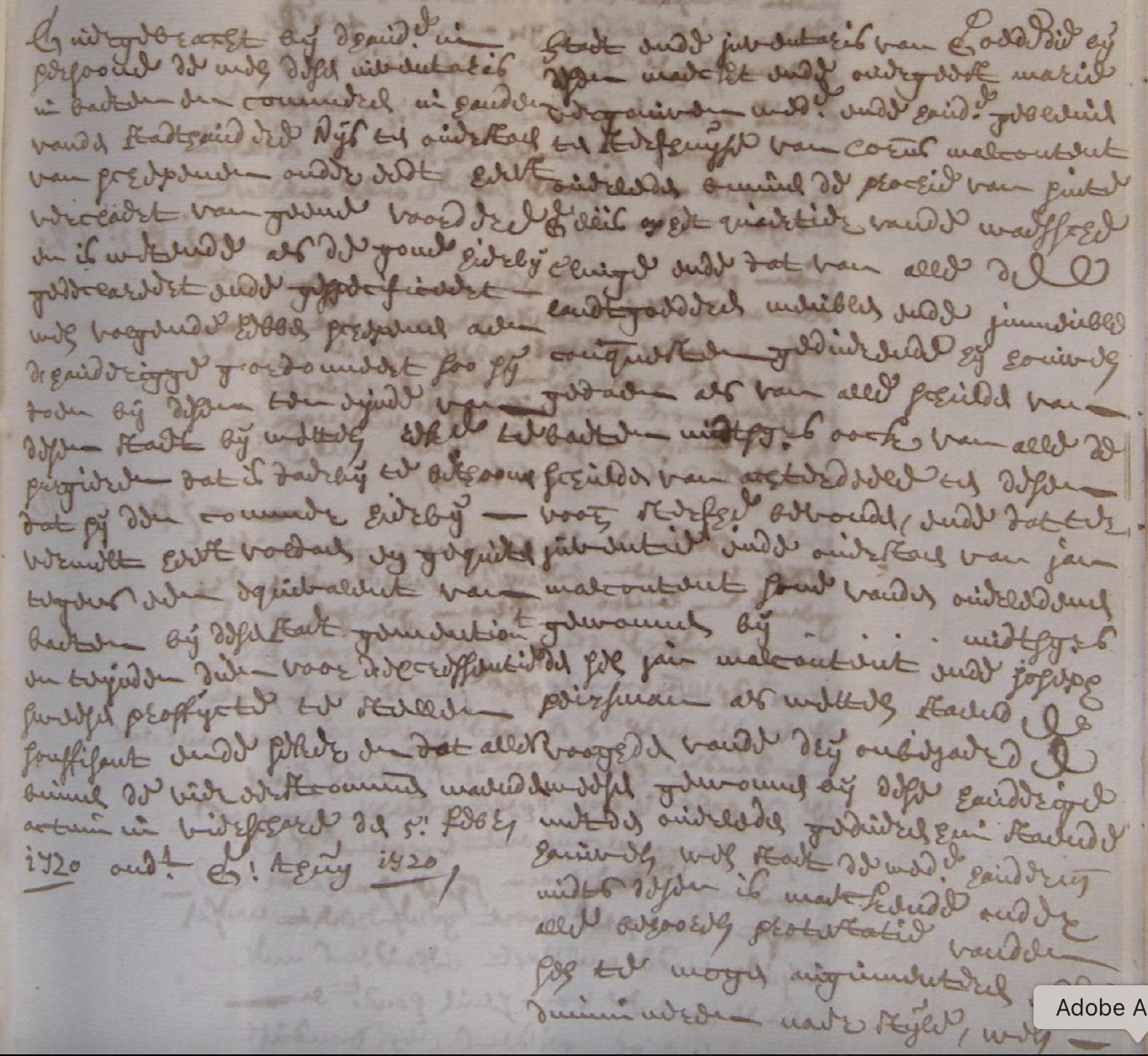 De tekst is niet volledig, de tekst rechts eindigt midden in een zin. Het zal dus op de ommezijde verder gaan. Het document is een inventaris van de goederen, zoals die nagelaten zijn bij het overlijden van Cornelis Malcontent. De inventaris is opgemaakt door de weduwe, die tevens vermeld wordt als hauderigge = houderigge = boedelhoudster. Deze inventaris diende te worden opgemaakt om te bekijken welke waarde een erfenis had. Kinderen uit een huwelijk hadden namelijk bij het overlijden van een van hun ouders recht op hun kindsdeel in de erfenis. Om vast te stellen welke waarde dit kindsdeel had, moest de waarde van de erfenis vastgelegd worden. De weduwe hield wel het vruchtgebruik, maar moest dan de kindsdelen aan de kinderen uitkeren op het moment dat deze meerderjarig werden (d.w.z. op het moment dat ze trouwden of (als ze tot dan toe ongehuwd bleven) op hun 25e verjaardag).