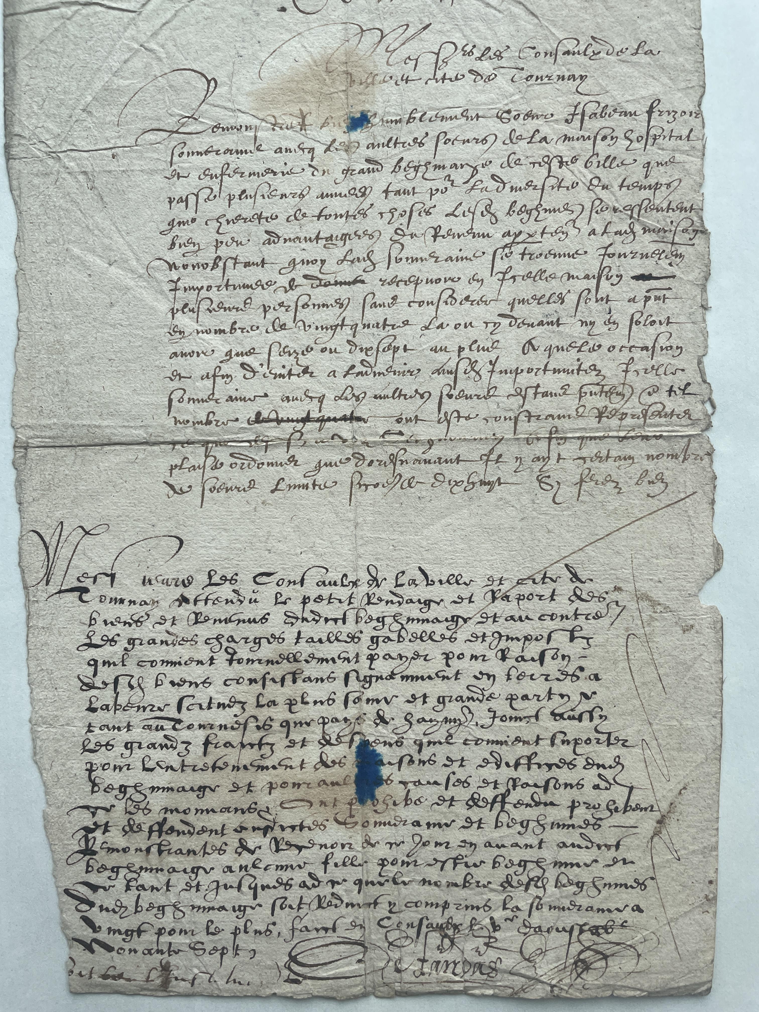 Als ik het zo doorlees, lijkt het een verzoek van de moeder-overste van het Groot Begijnhof aan het stadsbestuur van Doornik te zijn waarin ze vraagt om het aantal toe te laten begijnen te maximeren; mogelijk heeft dit ook te maken met de belastingheffing op de huizen van begijnen. Het bovenste deel is het verzoek, het onderste het antwoord. Maar de uiteindelijke transcriptie zal t.z.t. meer duidelijk maken.