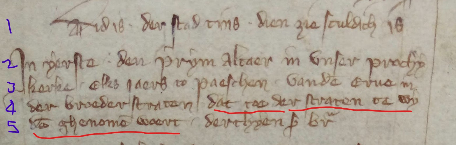 Beste liefhebbers van oude handschriften, ik heb hier een 14e eeuwse txt in het middelnederlands. De txt is goed te lezen, maar ik heb moeite om het te begrijpen. Misschien begrijpt iemnd van jullie het beter dan ik. Het gaat mij met name om de regels (4) en (5). Ik geef hieronder de transcriptie en vertaling. Elke suggestie is welkom.