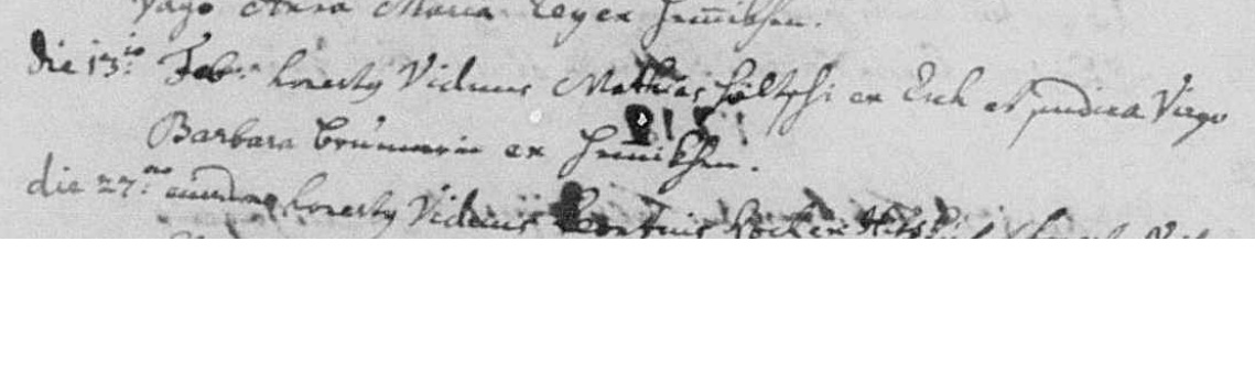 De bruidegom is een honestus viduus = eerzame weduwnaar uit Aesch (ex Esch), de bruid een pudica virgo = een kuise maagd uit Hünikon (ex Hünikhen)