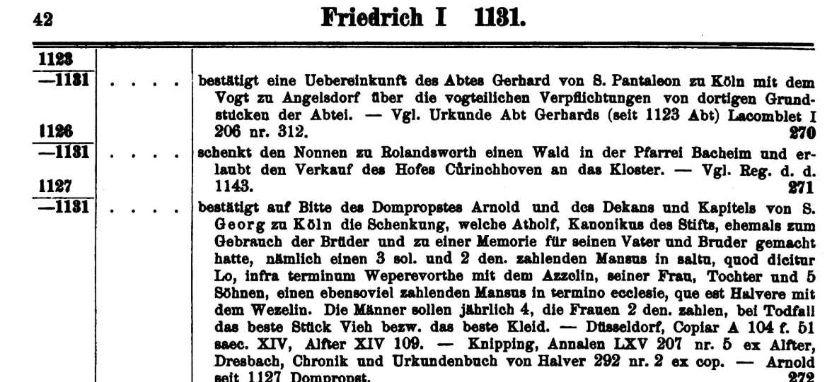 Frithericus, aartsbisschop van de kerk van Keulen, heeft op verzoek van Arnoldus, proost van Sint-Pieter en deken, en de gehele congregatie van Sint-Joris, besloten te vernieuwen wat Atholfus, kanunnik van Sint-Joris, ter nagedachtenis en tot heil van de zielen van zijn vader en broer, voor eeuwig heeft overgedragen en vrijgemaakt namelijk twee hoeven aan dezelfde Sint-Joris.