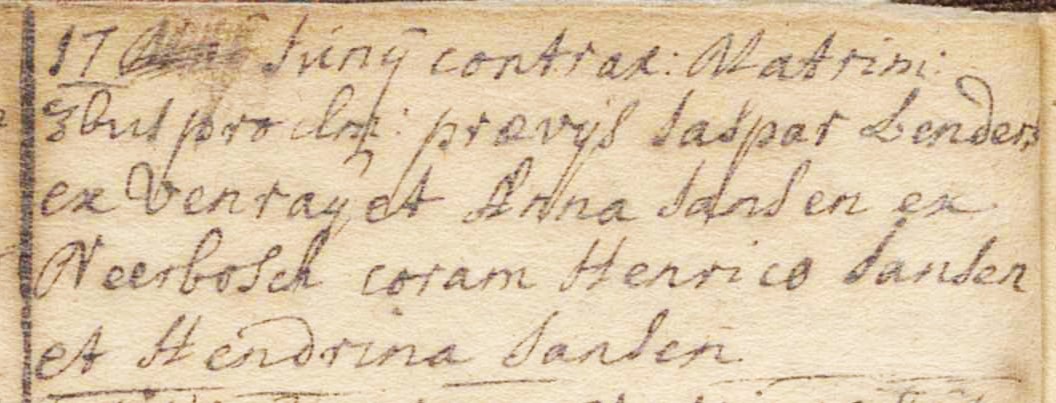 Beste mensen, Kan iemand mij helpen deze tekst aan te vullen of te verbeteren? 17 junij (1731) zijn getrouwd [onleesbaar] voorgaande afkondigingen [??] Jasper Lenders uit Venray en Anna Jansen uit Neerbosch in aanwezigheid vanHenricus Jansen en Hendrina Jansen. Alvast veel dank. Annie