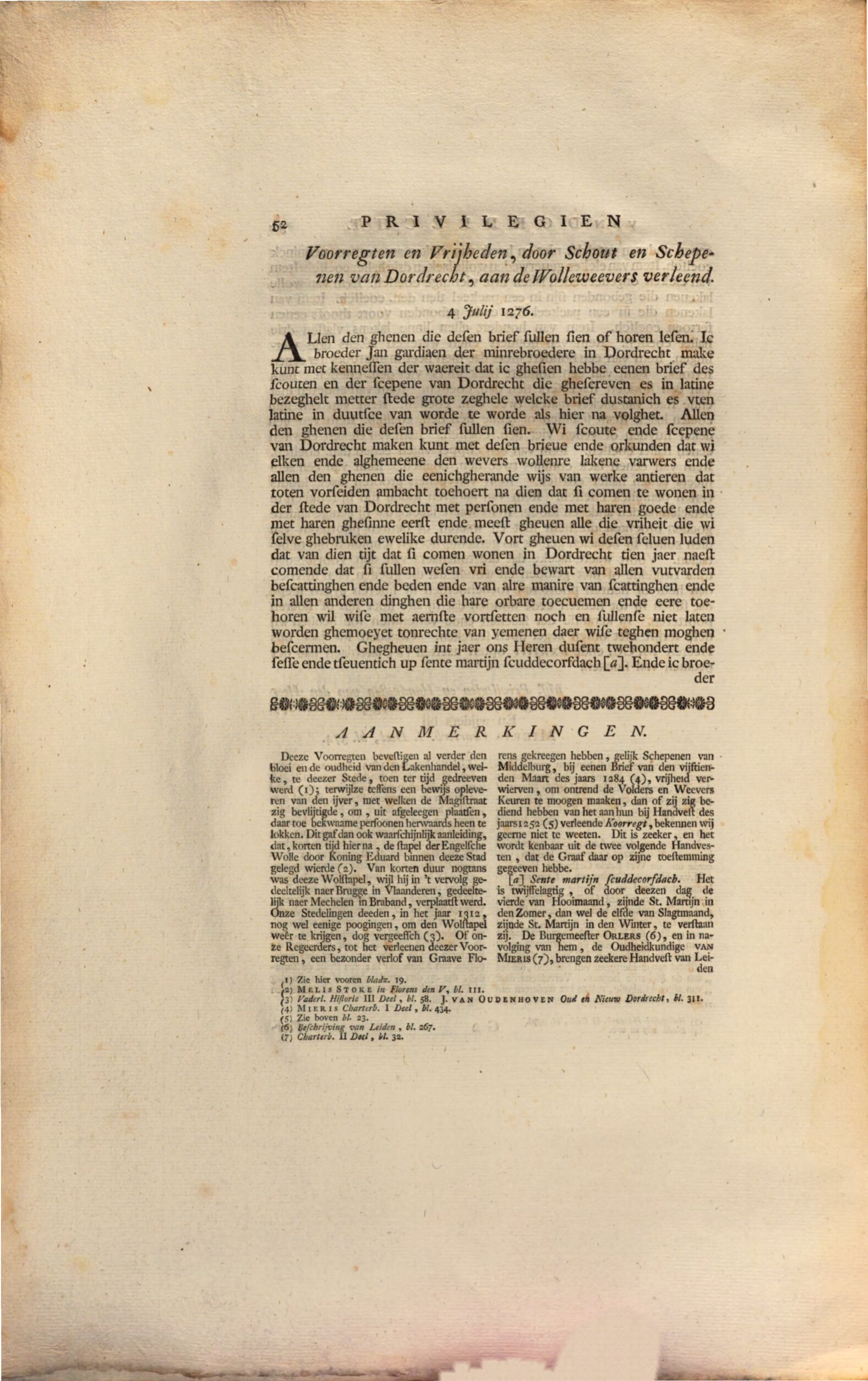 Beste Leo, er bestaat al een tamelijk oude editie van deze tekst in de bronnenuitgave door P.H. van de Wall, Handvesten, privilegien, vrijheden (...) der stad Dordrecht I (Dordrecht: Van Braam, 1770), online te München, https://www.digitale-sammlungen.de/en/view/bsb10623432?page=68,69 . Er is een moderne editie in het Oorkondenboek van Holland en Zeeland als nr. III, 1740, 1276 juli 4 [p. 858-859], online bij het Huygens Instituut, https://resources.huygens.knaw.nl/retroboeken/ohz/#source=3&page=875&vi… , maar daarin is de tekst van de gardiaan weggelaten. Het origineel uit 1276 is niet meer voorhanden, de vidimering wint daardoor aan belang (RA Dordrecht, toegang 16, Gilden en confrerieën, inv.nr. 395). Het werkt het snelste voor mij om hier scans uit Van de Wall toe te voegen, zo dadelijk volgt de tweede bladzijde.