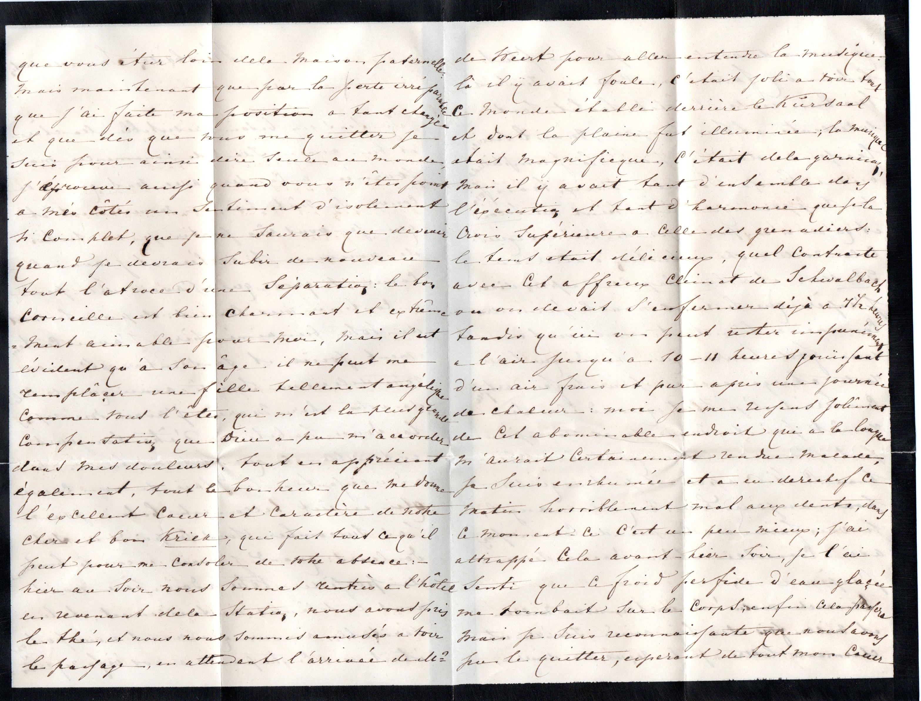 Meneer de Weert was me net een verhaal aan het vertellen, dat hij onmiddellijk onderbrak toen hij merkte dat het een brief van u was, om me er rustig van te laten genieten. Ik ben zo blij te horen dat u zich beter voelt, minder verhit, met een helderder hoofd en niet zo zwaarmoedig. Ik ben er zeker van dat de verandering voor dit effect heeft gezorgd, en dat dit ellendig gevoel u langzaam zal verlaten. Vandaag, met het mooie weer, zal uw uitstapje naar Homburg u plezieren. Het belooft echter warm te worden, maar in een open rijtuig is het een aangename tocht.