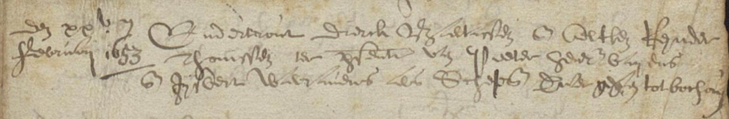 Dierck gaat op 25 februari 1653 in ondertrouw met Aaltken en doet dit voor de schepenen ter plaatse. Het betreft hier een ondertrouwinschrijving en dus geen trouwinschrijving. Na de ondertrouwinschrijving werd het voorgenomen huwelijk op drie achtereenvolgende zondagen afgekondigd in kerk en/of aan de muur van het gemeentehuis. Alleen als geen van deze drie afkondigingen wettige bewaren hadden opgeleverd, mocht het huwelijk voltrokken worden. Als een van beiden redelijk recent in een andere plaats gewoond had, moesten de aankondigingen ook in de oude woonplaats gebeuren en bewijs overlegd worden dat ook daar geen bezwaren tegen het huwelijk naar waren waren gebracht. Blijkens de laatste zin van de inschrijving woonde ten minste een van beiden redelijk kort voor het huwelijk in Borghout.