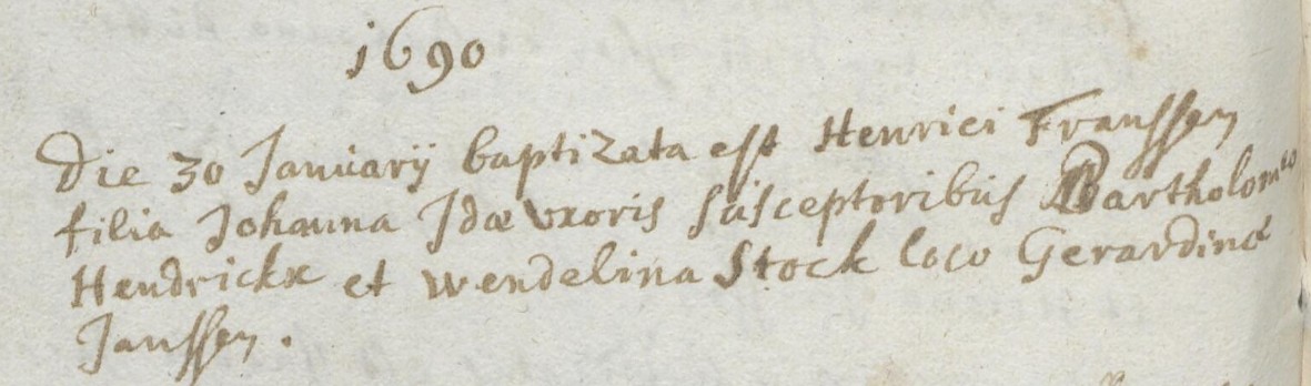 Zie onderstaande. Probleem is dat het in doopboeken uit deze tijd niet altijd gebruikelijk was om de naam van de moeder te vermelden, die dan ook ontbreekt in deze inschrijving.