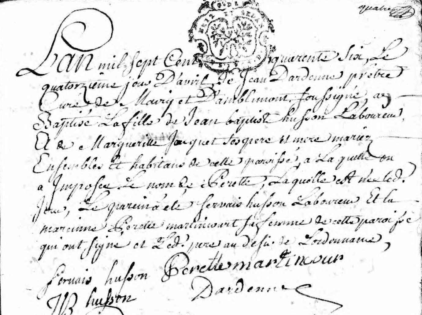 Het betreft de doop en inschrijving in het kerkregister van de dochter van Jean Baptiste Husson en 'Margueritte' Jacquet, van wie wordt opgemerkt dat ze met elkaar getrouwd zijn ('le père et mère mariéz'). Het meisje heet Perette. Jean is landbouwer (laboureur). Plaats is d'Amblimont.
