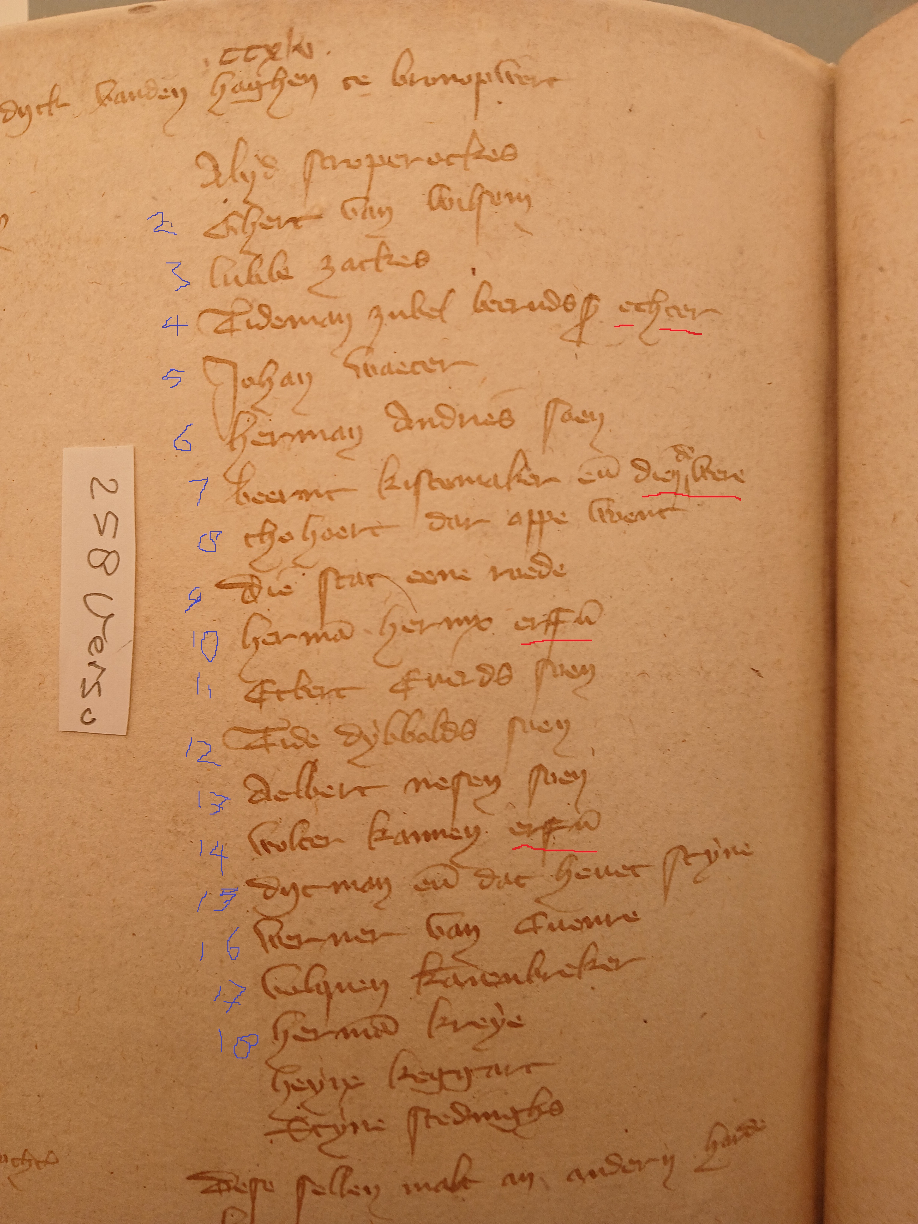 ik heb hier een namenlijst, geschreven in de 14e eeuw, in het middelnederlands. Op enkele plaatsten heb ik moeite met lezing. Misschien wil iemand van jullie meekijken? Elke suggestie is van harte welkom. De probleemwoorden heb ik met rood onderstreept: