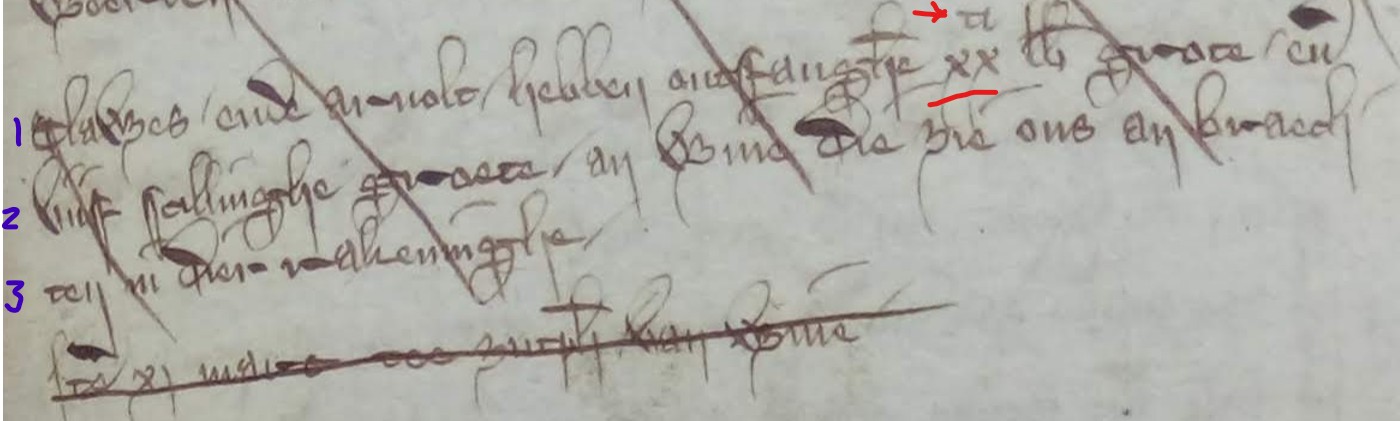 Ik heb hier een txt (14e eeuw) in het middelnederlands. De scriba noteert ‘xx librae’ ( 20 pond), maar boven het getal ‘xx’ schrijft hij een teken dat ik niet herken (rood aangegeven). Misschien kan iemand van jullie mij verder helpen? Elke suggestie is welkom. Hieronder de transcriptie van de txt. Bij voorbaat dank.