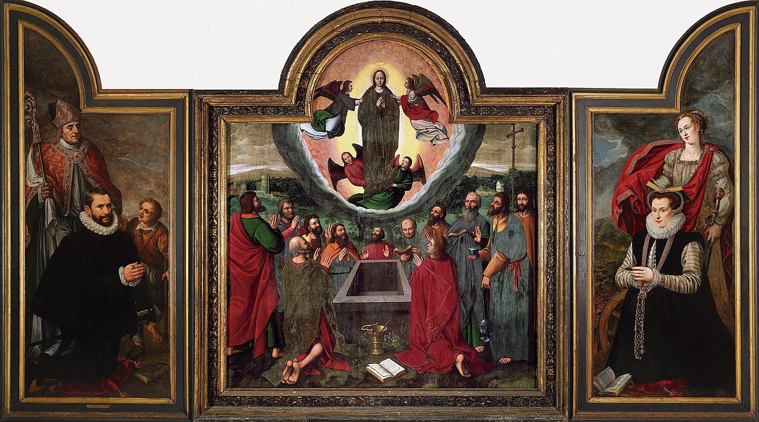 Fantastisch waar onderzoek naar een naam toe kan leiden. Adriaen Thomasz Key is dan de toeschrijving voor de zijpanelen met de schenkers. De nieuwe catalogue raisonné (https://www.brepols.net/products/IS-9782503619262-1) zou meer info kunnen bevatten, maar is nog niet beschikbaar op het RKD.