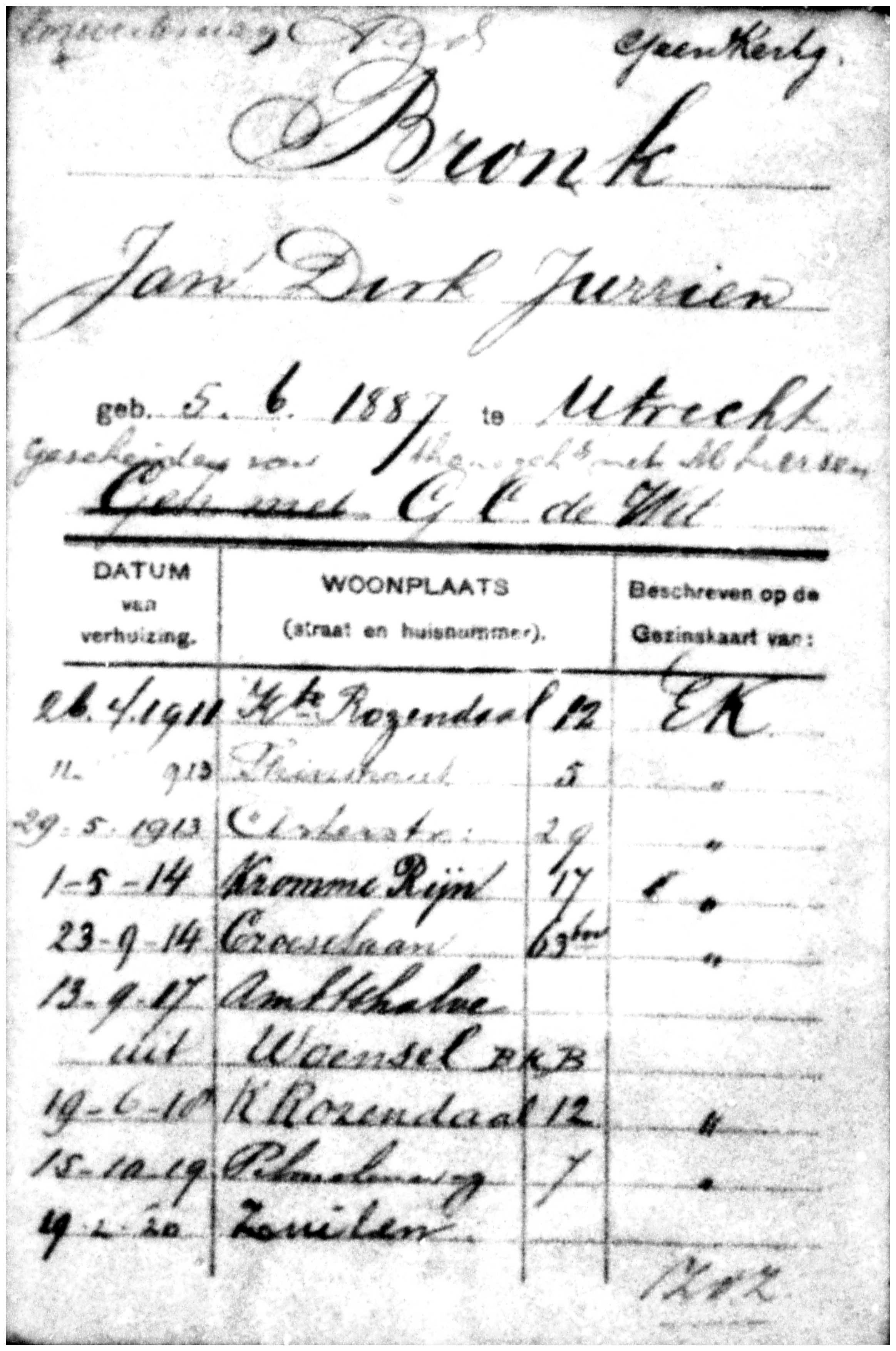 Dit is een "scan" van een microfiche op Het Utrechts Archief. Linksboven staat iets geschreven dat we niet kunnen ontcijferen. Het zou iets te maken kunnen hebben met het beroep van Jan Dirk Jurrien Bronk, mijn opa. Hij stond wel geregistreerd als los arbeider, fabrieksarbeider, grondwerker, etc. Het zou ook kunnen gaan over zijn militair pensioentje, hij was met de KNIL in N.O. Indië. Maar het kan ook iets heel anders zijn.