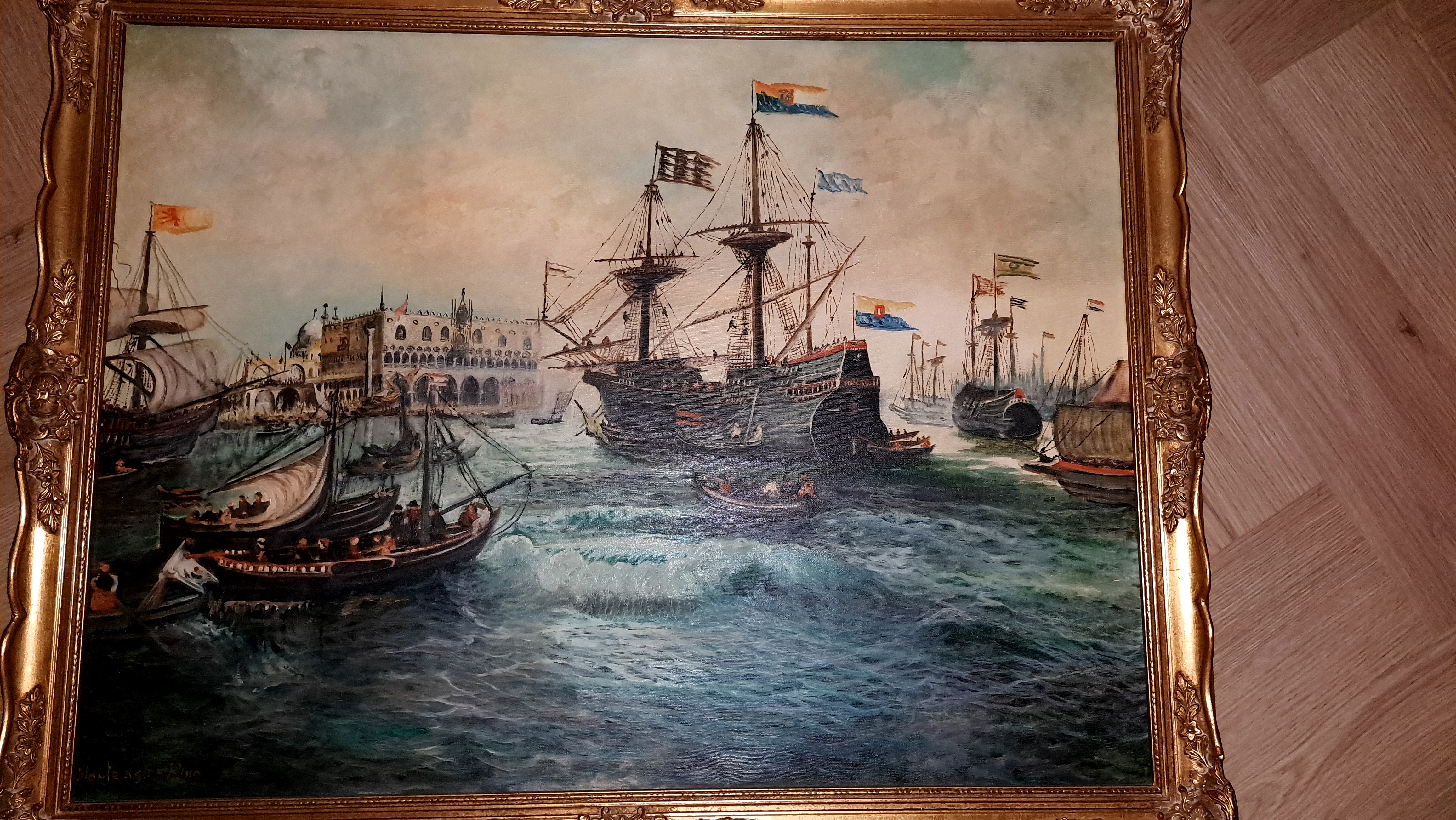 Uw schilderij met signatuur Montrasti-Pino is een moderne pastiche naar het schilderij De terugkomst in Amsterdam van de tweede expeditie naar Oost-Indië op 19 juli 1599 van Andries van Eertvelt (Antwerpen 1590 - Antwerpen 1652) in National Maritime Museum, Greenwich, London, Caird Collection, inv.nr. BHC0748: https://www.rmg.co.uk/collections/objects/rmgc-object-12240