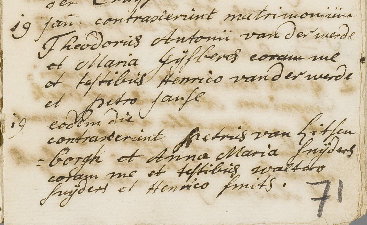 Het gaat hier ook om een huwelijksinschrijving, 'eodem die' betekent 'op dezelfde dag'. Petrus van Litsenbergh en Anna Maria Snijders zijn ook op 19 januari getrouwd.