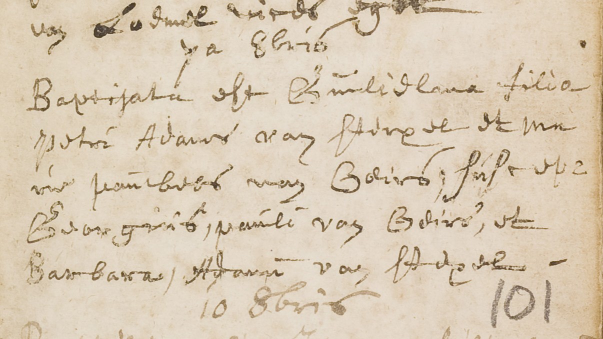 Baptisata est Guilielma filia Petri Adams van Sterxel et Marie Pauwels van Beirs (Beers) / Oeirs (Oers) / Geirs, Suscep(tores): Georgius Pauli van Beirs / Oeirs / Geirs et Barbara Adami van Ste(r)xel.