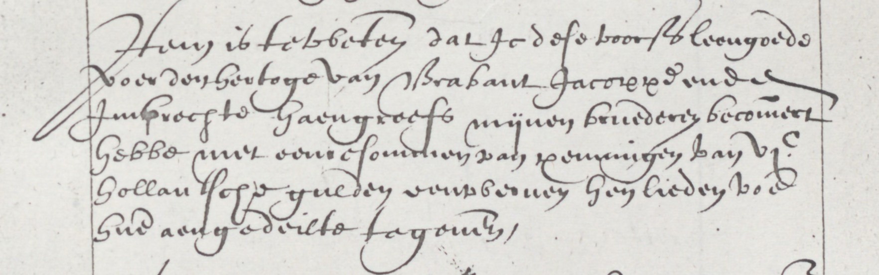 Item is te weten dat ik dit voorgenoemde leengoed voor de hertog van Brabant belast heb met penningen tezamen ter waarde van 600 Hollandse guldens om mijn broers Jacoppe en Imbrechte Haengreefs eenmalig voor hun aandeel te geven