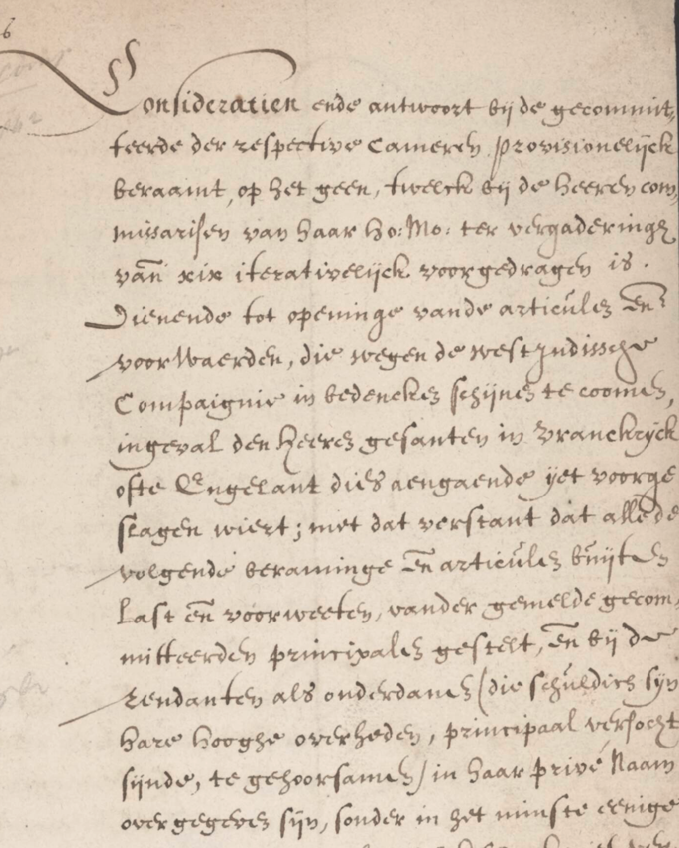 Beste Lucia, het gaat om een reactie van de commissarissen van de verschillende kamers van de Heeren XIX op een voorstel van afgevaardigden van de Staten-Generaal over een kwestie rond de WIC waarop de gezanten van Frankrijk of Engeland mogelijk kunnen gaan reageren; al het navolgende is opgesteld zonder lastgeving en medeweten van de genoemde gecommitteerden van de Staten-Generaal. Kort en goed, wat volgt is nogal onder voorbehoud en met alle verschuldigde eerbied en gehoorzaamheid geformuleerd.