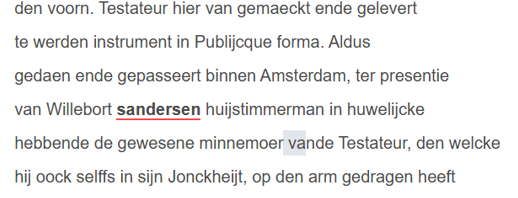 Willebort Sandersen wordt hier vermeld als een van de twee getuigen die naast de direct betrokkenen aanwezig moesten zijn om een notariële akte rechtsgeldig te laten zijn. Vaak waren dit notarisklerken of speciaal hiervoor gevraagde getuigen die verder geen relatie hadden tot degene die direct betrokken waren bij de inhoud van de notariële akte. In dit geval kenden de opsteller van het testament (de testateur) en de getuige elkaar dus wel al heel lang: Willebort Sandersen was dus de getuige en de echtgenoot van de vrouw die de testateur als zuigeling had verzorgd.